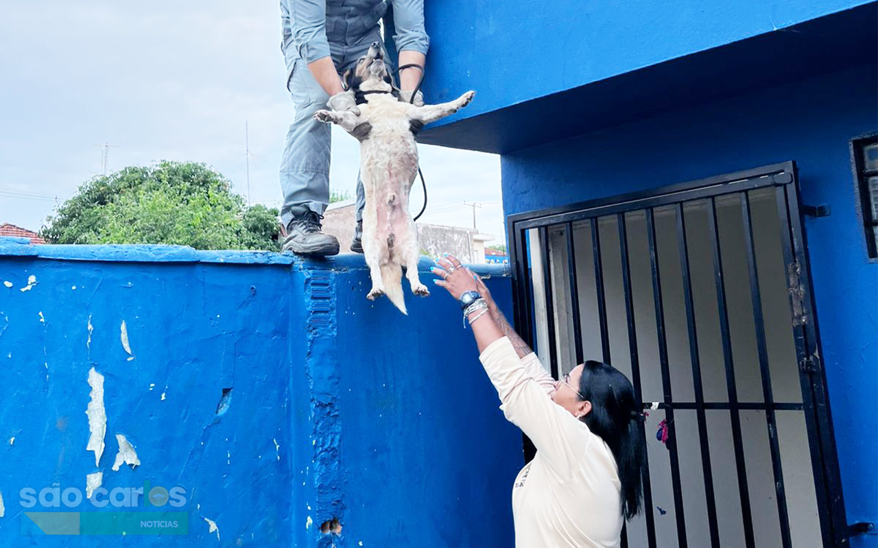 Cão é resgatado de laje em São Carlos durante operação conjunta entre secretaria municipal e Corpo de Bombeiros. Animal recebe cuidados no Canil Municipal.