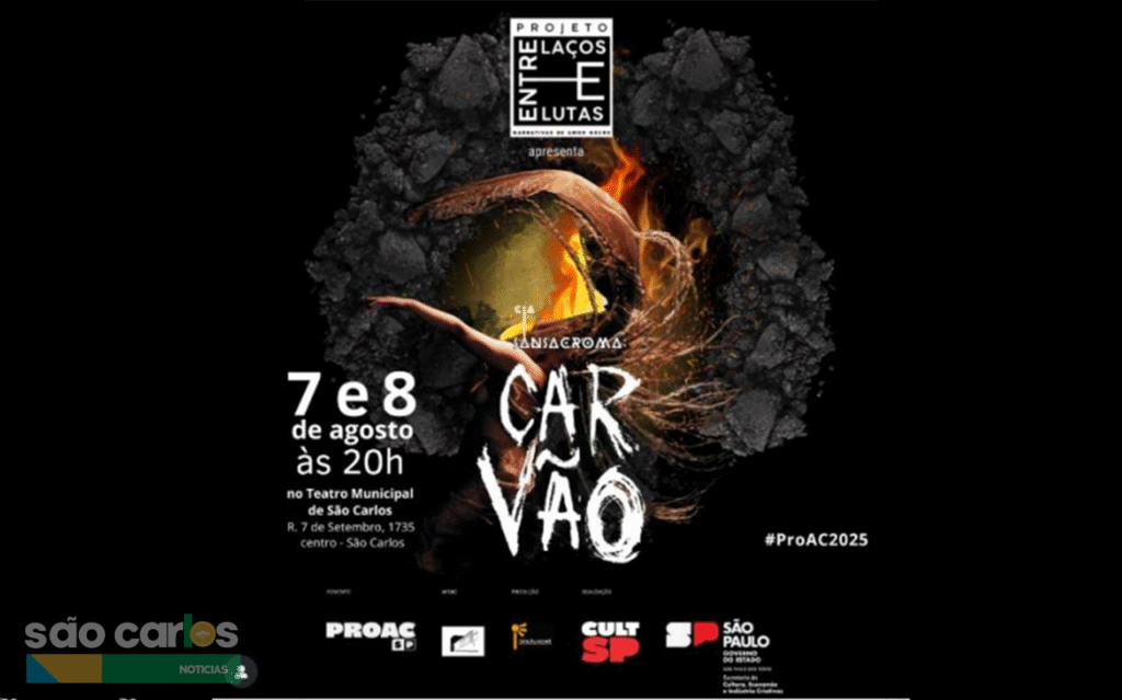 São Carlos, 7 de agosto de 2025 – A cidade recebe nesta semana um dos espetáculos de dança contemporânea mais impactantes da cena cultural brasileira. “Carvão”, da renomada Cia Sansacroma, será apresentado gratuitamente no Teatro Municipal “Dr. Alderico Vieira Perdigão” nos dias 7 e 8 de agosto, às 20h. A iniciativa integra o programa Fomento CULTSP PROAC nº 23/2024, viabilizado pela Secretaria Municipal de Cultura e Turismo.