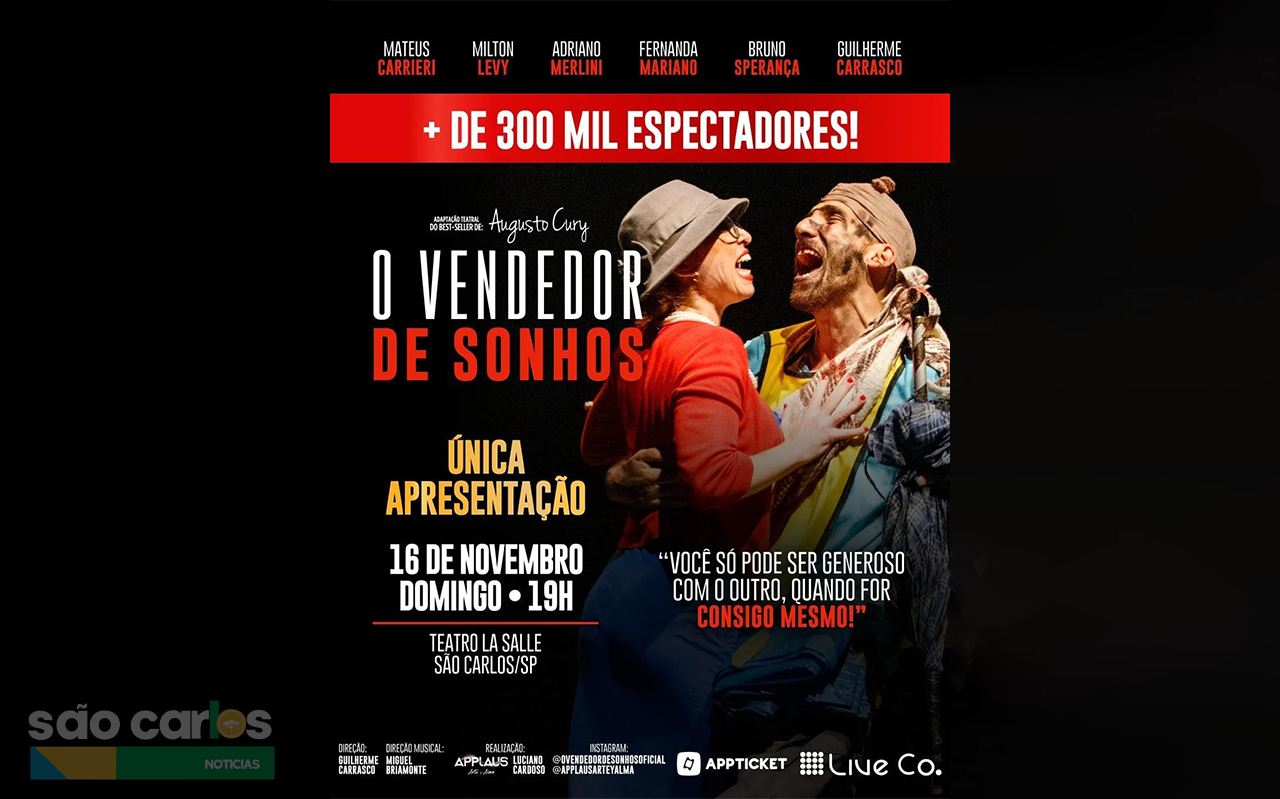 A peça “O Vendedor de Sonhos”, sucesso de público com mais de 300 mil espectadores, será apresentada em São Carlos