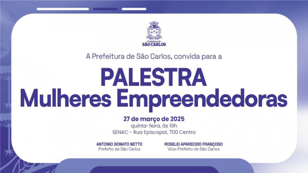 A Prefeitura de São Carlos, por meio da Secretaria de Desenvolvimento Econômico, Ciência e Tecnologia e do Departamento do Banco do Povo, convida todas as mulheres empreendedoras e aquelas interessadas em ingressar no mundo do empreendedorismo para participar da palestra “Mulheres Empreendedoras”, em celebração ao Mês da Mulher.