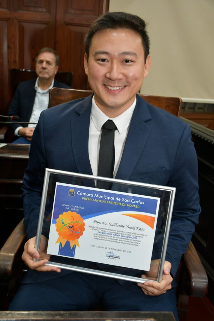 Já o professor Guilherme Yuuki Koga, vencedor do Prêmio Antônio Pereira de Novaes (Pesquisador Júnior), destacou o acolhimento e a humanidade que encontrou em São Carlos desde 2008.