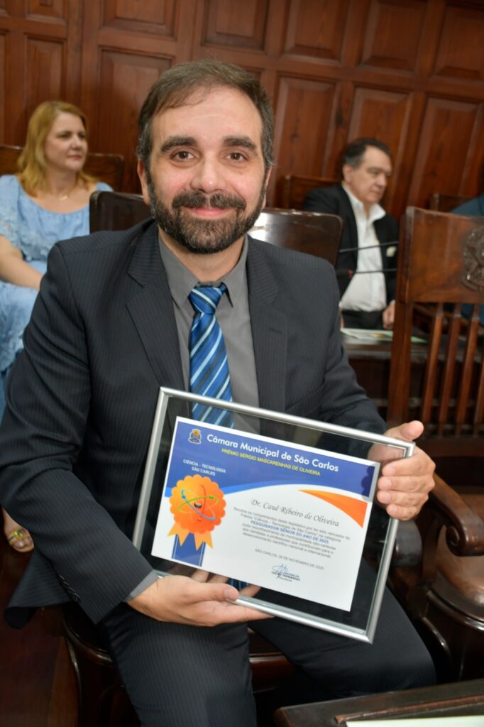 Entre os homenageados da noite, o pesquisador Cauê Ribeiro de Oliveira, vencedor do Prêmio Sérgio Mascarenhas de Oliveira (Pesquisador Sênior), relembrou sua chegada à cidade há 30 anos para cursar engenharia de materiais na UFSCar e ressaltou o valor do reconhecimento para quem dedica a vida à pesquisa.