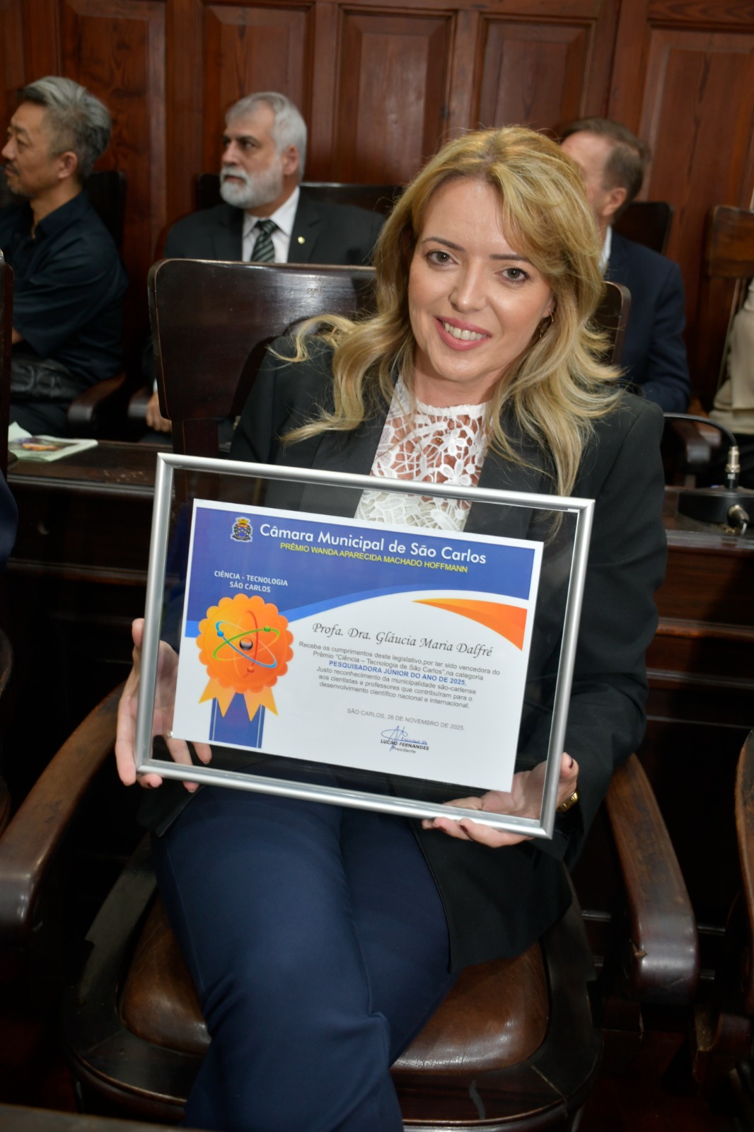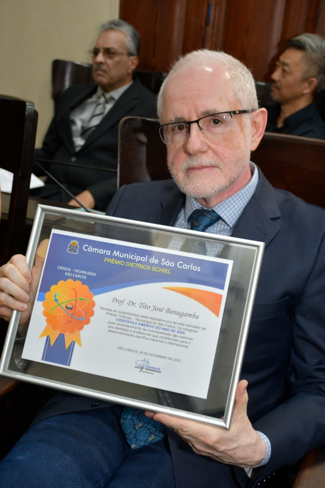 Na noite da última quarta-feira, 26 de novembro, a Câmara Municipal de São Carlos foi palco da cerimônia de entrega do Prêmio Ciência e Tecnologia 2025, instituído pela Lei nº 12.618/2000. O evento reuniu autoridades, acadêmicos e representantes da sociedade, reforçando a vocação da cidade como polo nacional de ciência e inovação.