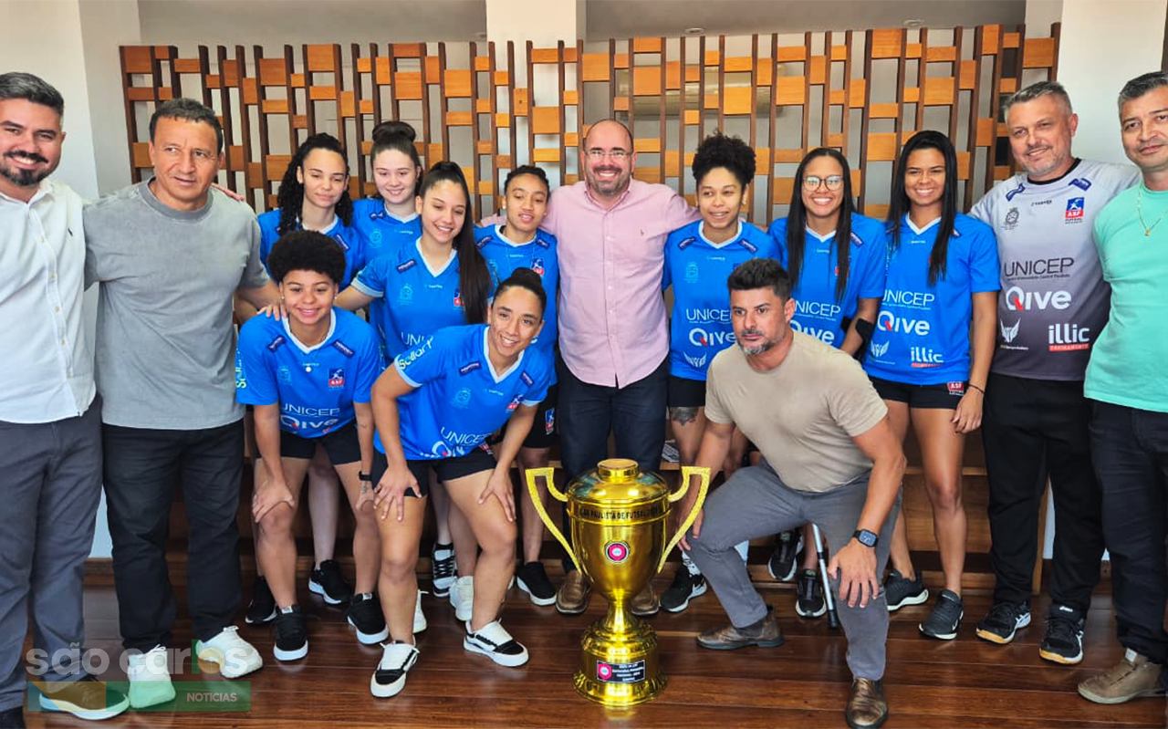 ATLETAS BICAMPEÃS DA ASF/UNICEP SÃO CARLOS foram recebidas no Paço Municipal nesta quarta-feira, 26 de novembro de 2025. O encontro