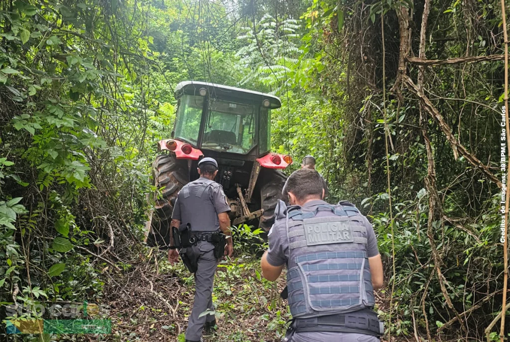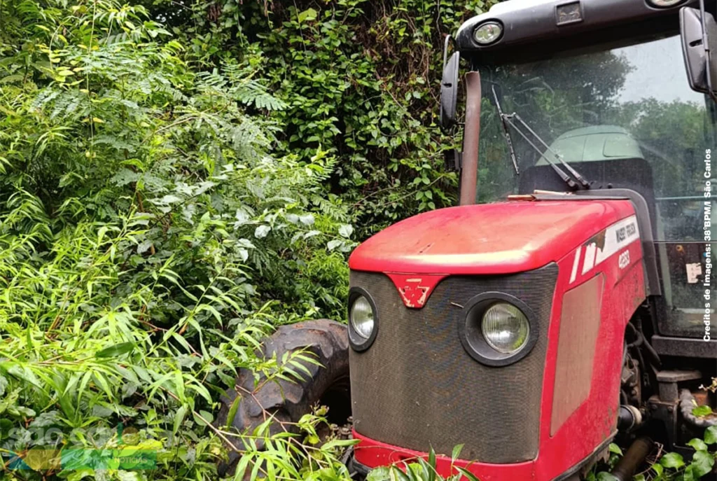 Os policiais militares, com apoio das equipes de São Carlos e do Comando de Grupo Patrulha localizaram o trator escondido entre as árvores. Nenhum suspeito foi encontrado no local.