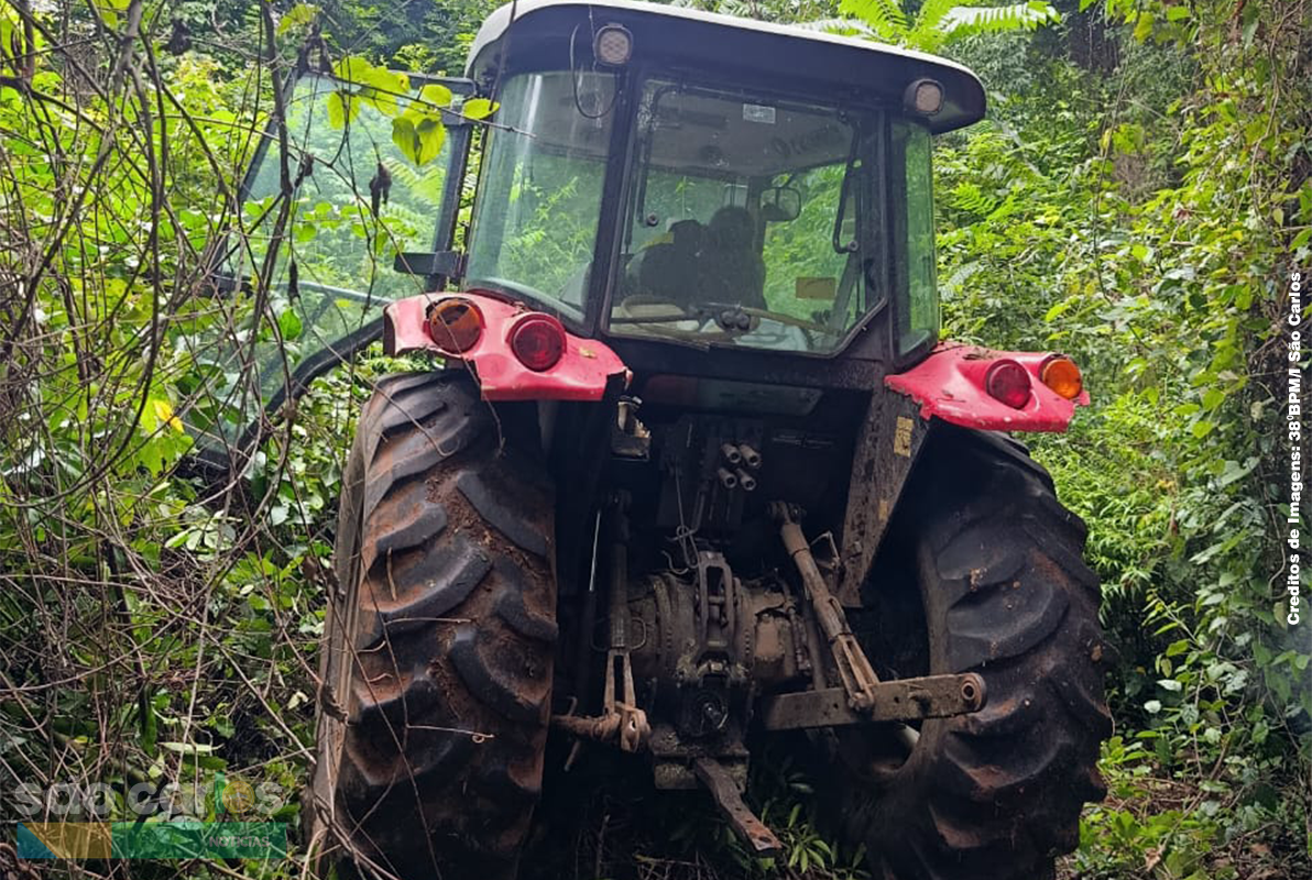 Os policiais militares, com apoio das equipes de São Carlos e do Comando de Grupo Patrulha localizaram o trator escondido entre as árvores. Nenhum suspeito foi encontrado no local.