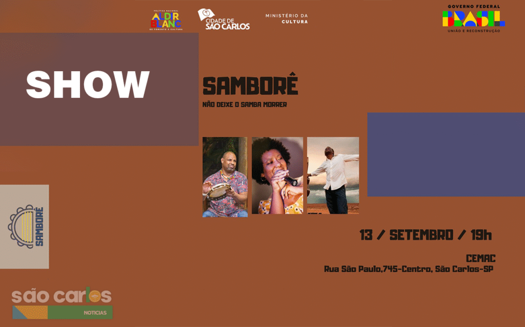 No próximo sábado, 13 de setembro, às 19h, o Centro Municipal de Arte e Cultura (CEMAC), em São Carlos, recebe o show “Não Deixe o Samba Morrer”, uma imersão musical e histórica promovida pelo grupo Samborê. Com entrada gratuita e classificação livre, o evento — contemplado pela Política Nacional Aldir Blanc (PNAB) — celebra o samba como expressão de luta, identidade e legado cultural afro-brasileiro.