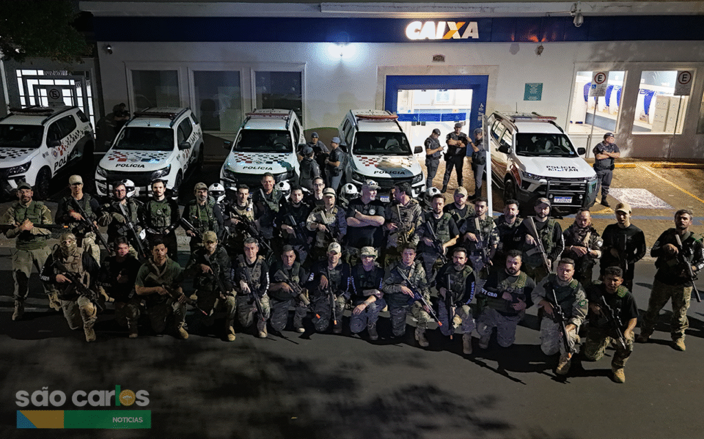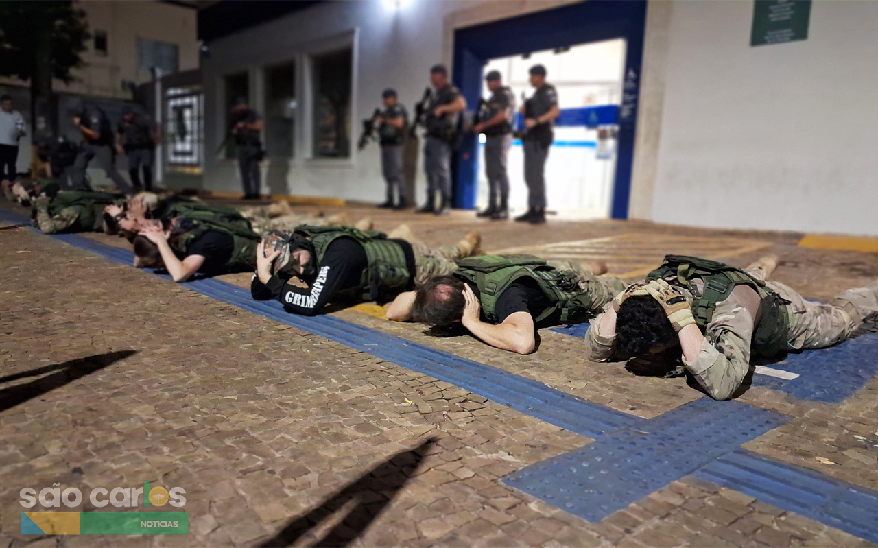 Simulado da Força Tática em São Carlos testa resposta a crimes ultraviolentos com explosão de caixa eletrônico. Treinamento envolveu 15 criminosos fictícios e técnicas de combate.